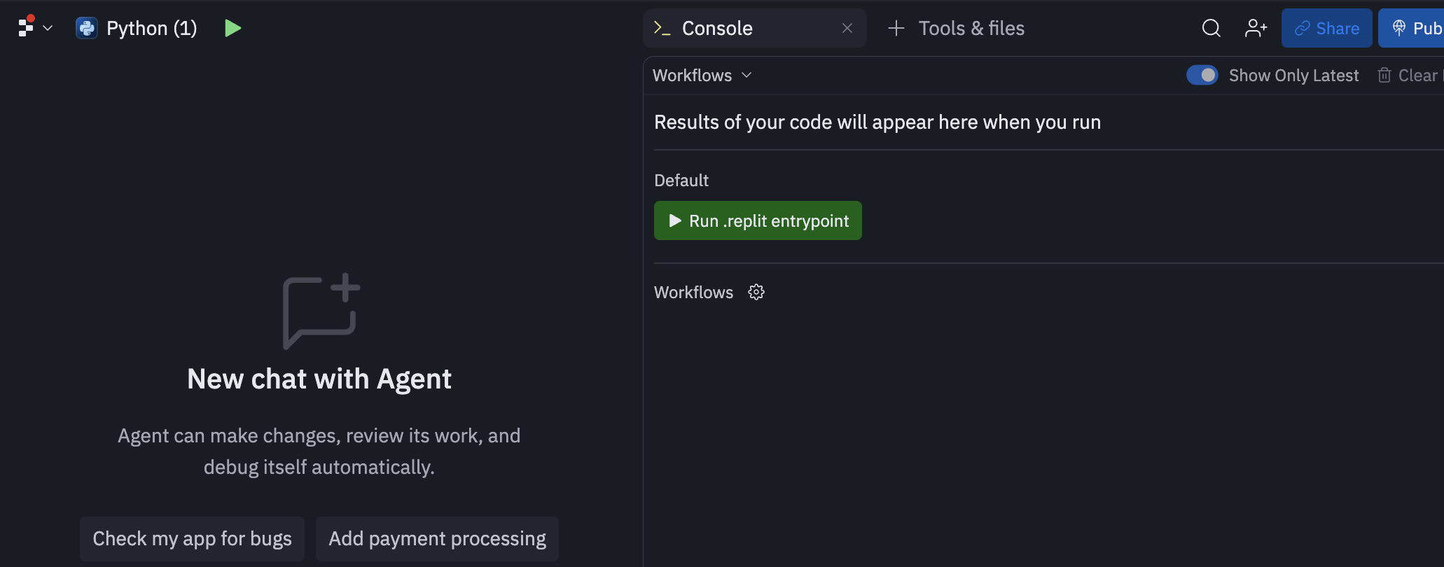 Drag the divider between the agent and the console such that the agent disappears. Then in the top right hit the button there such that you see a files tree appear. Then I want you to open up the main.py file.
