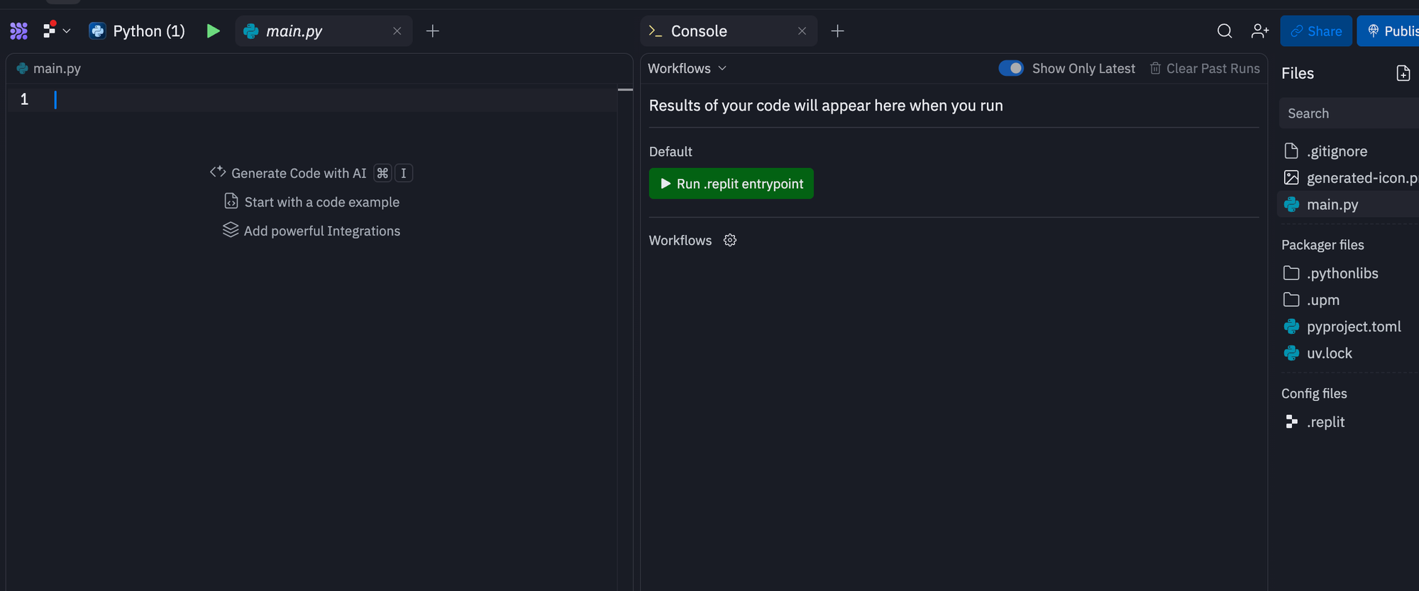 In main.py, enter 1 + 1 and hit the play button. Nothing will happen. The code ran, but we didn't instruct the program to output anything.